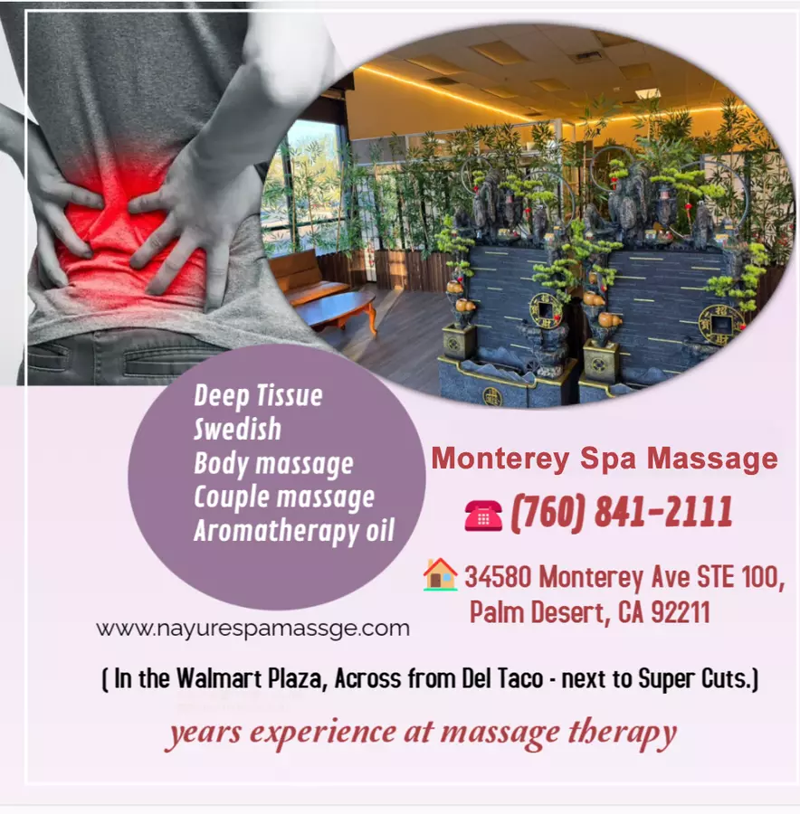 At Monterey Spa Massage in Palm Desert, CA, we pride ourselves on offering a diverse range of body massages and beauty spa treatments designed to help you start your journey towards a healthier lifestyle. Our expertly trained therapists are committed to providing personalized and top-notch services that cater to your unique needs. Whether you're seeking a rejuvenating deep tissue massage, a soothing Swedish massage, or a pampering beauty spa treatment, we have something for everyone. When you step out of Nayure Spa Massage, you'll feel not only relaxed but also recharged, ready to tackle whatever comes your way.